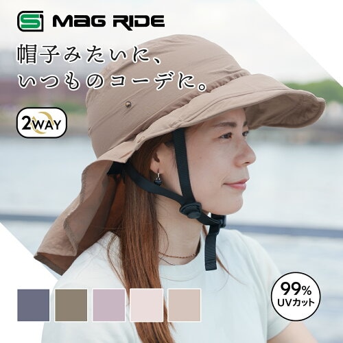 UVカット率99%の日よけ付きハット型ヘルメットです。つばの先端には形状記憶ワイヤーが内蔵されており、サイドのボタンを留めたり外したりすることで、異なるデザインを楽しめる2Way仕様になっています。