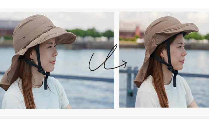 つば付きは日焼けを防ぐだけでなく、まぶしい日差しから目を守る効果もあり、普段着に合わせやすいデザインです。また、フェイスカバーと併用することで、顔の下半分の日焼けも防げます。