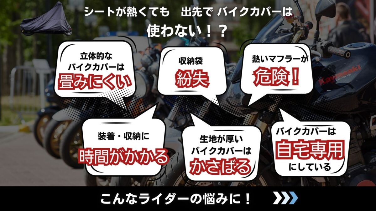 外出先の一時駐車でシートの熱さに悩むライダーを救いたい!|バイク用ちょい掛けカバー MotoBrella