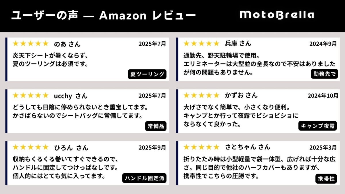 ツーリングから通勤、キャンプまで——様々なシーンでMotoBrellaを活用いただいています。