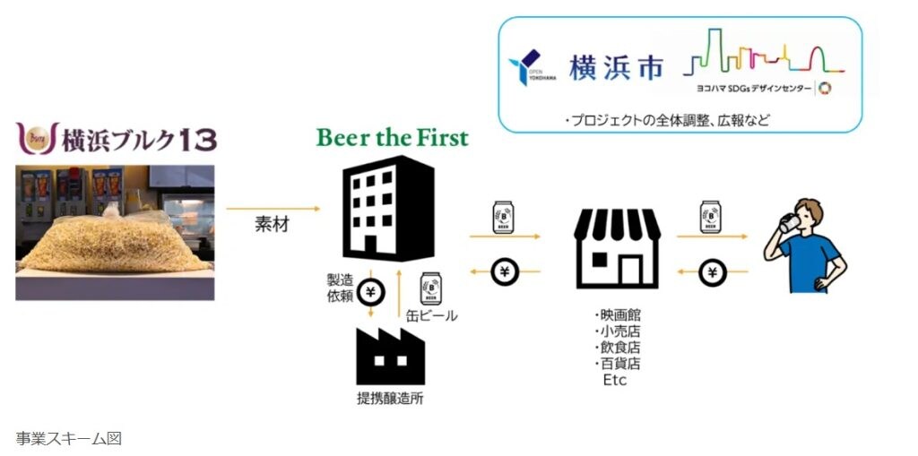 こうした状況を受け、横浜市とヨコハマSDGsデザインセンターは地域施設とともに食品ロス削減の検討会を開催。そこで、食品ロスを活用したクラフトビール製造を行う市内スタートアップ・株式会社 Beer the First と連携するアイデアが生まれた。シネマコンプレックスの「横浜ブルク13」から提供されたポップコーンを麦芽と混ぜ、仕込み原料の一部として活用することで、ビール製造の工程に食品ロス削減の仕組みを組み込むことに成功した。