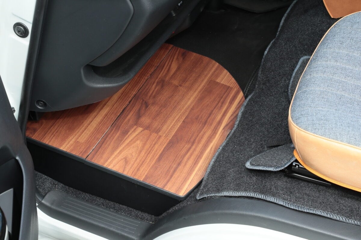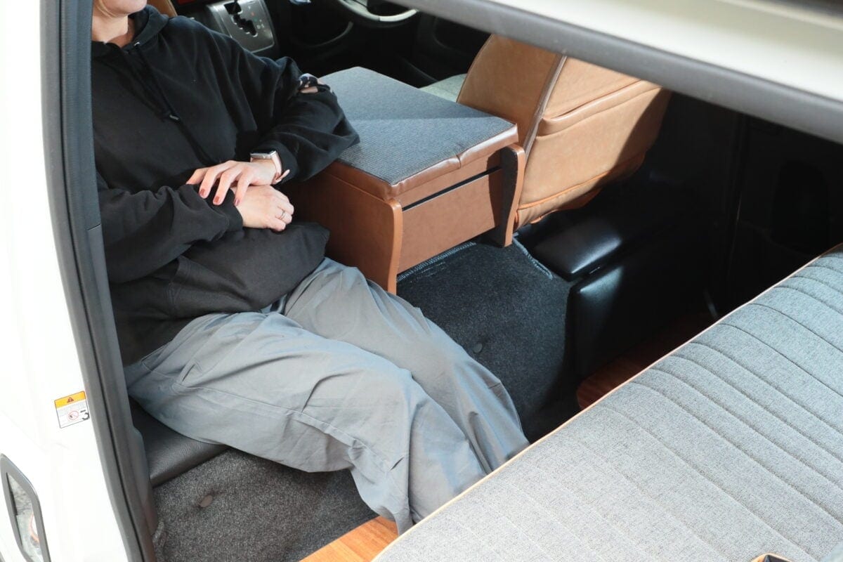 靴を脱いでフロアに敷いたベッドマットに座れば、まるで小さなカフェのような空間に変身。食事をしたり、くつろいだりと、車内とは思えないリラックスできる空間が完成するのだ。
