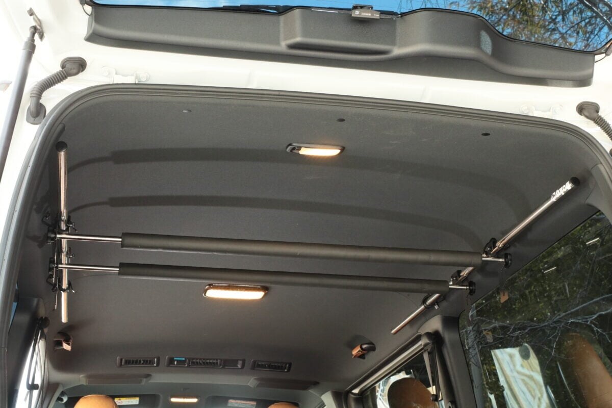 そのホルダーに3段階高さ調整式(天井から約150/200/250mm)のルームキャリアがセットになっている。脚立やサーフボードなど長物を載せられる。