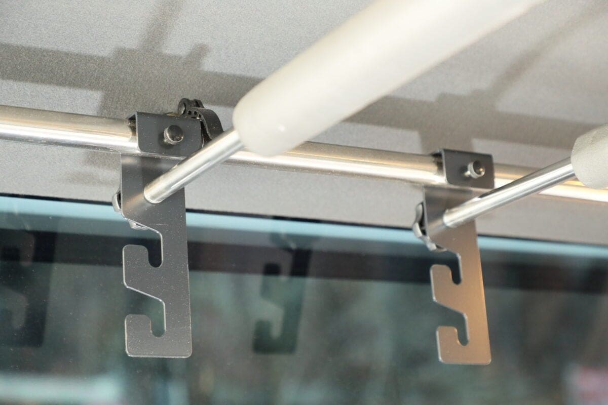 天井クリップを外して、付属ボルトをドライバーで締めるだけで取り付けできるマルチキャリアハンガー。パイプの全長は1500mm、太さは25φ。前後の位置調整で、荷室のどの位置でも使用可能。