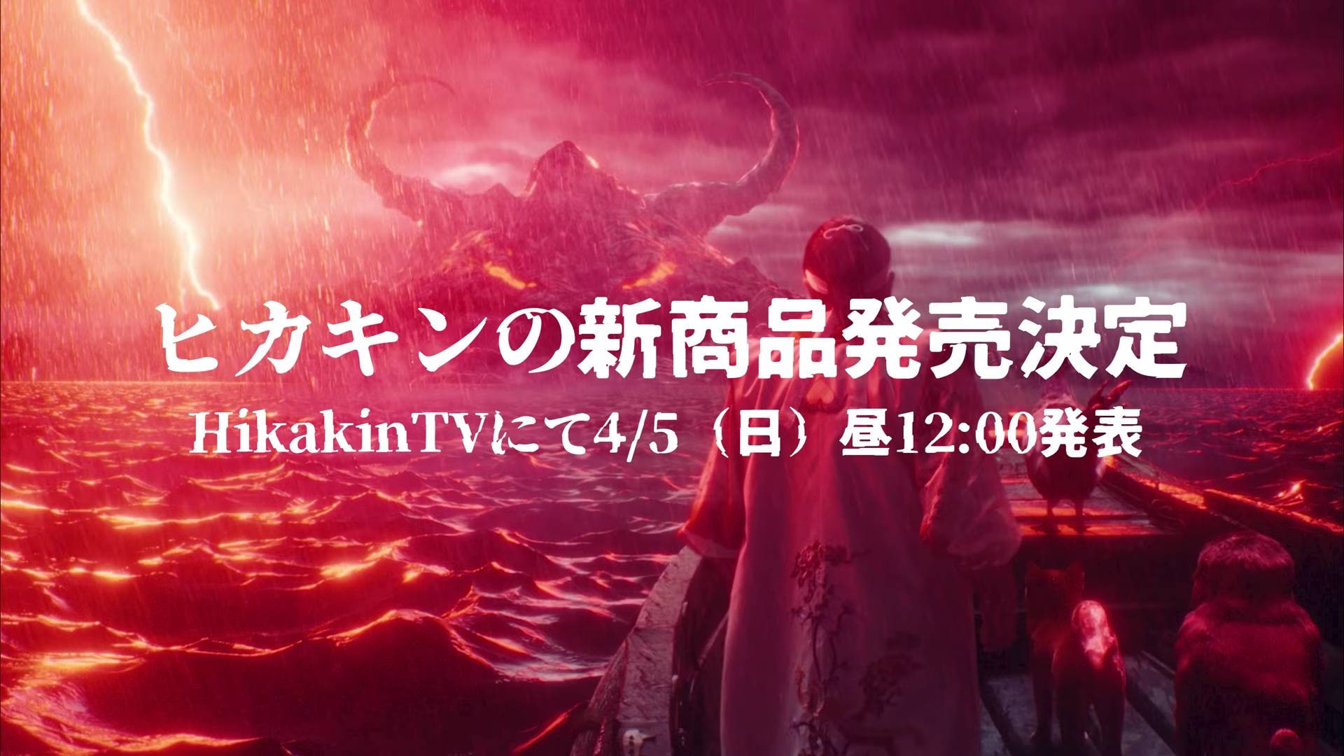動画内では新商品のヒントとなる映像も公開されました。雨の降る荒れた海で、ピンク色の稲妻が走る中、桃太郎に扮したヒカキン一行が奥に見える鬼ヶ島へ小舟で向かっていく様子が描かれた映像で、画面には「ヒカキンの新商品発売決定」「HikakinTVにて4/5(日)昼12:00発表」の文字が重ねられています。