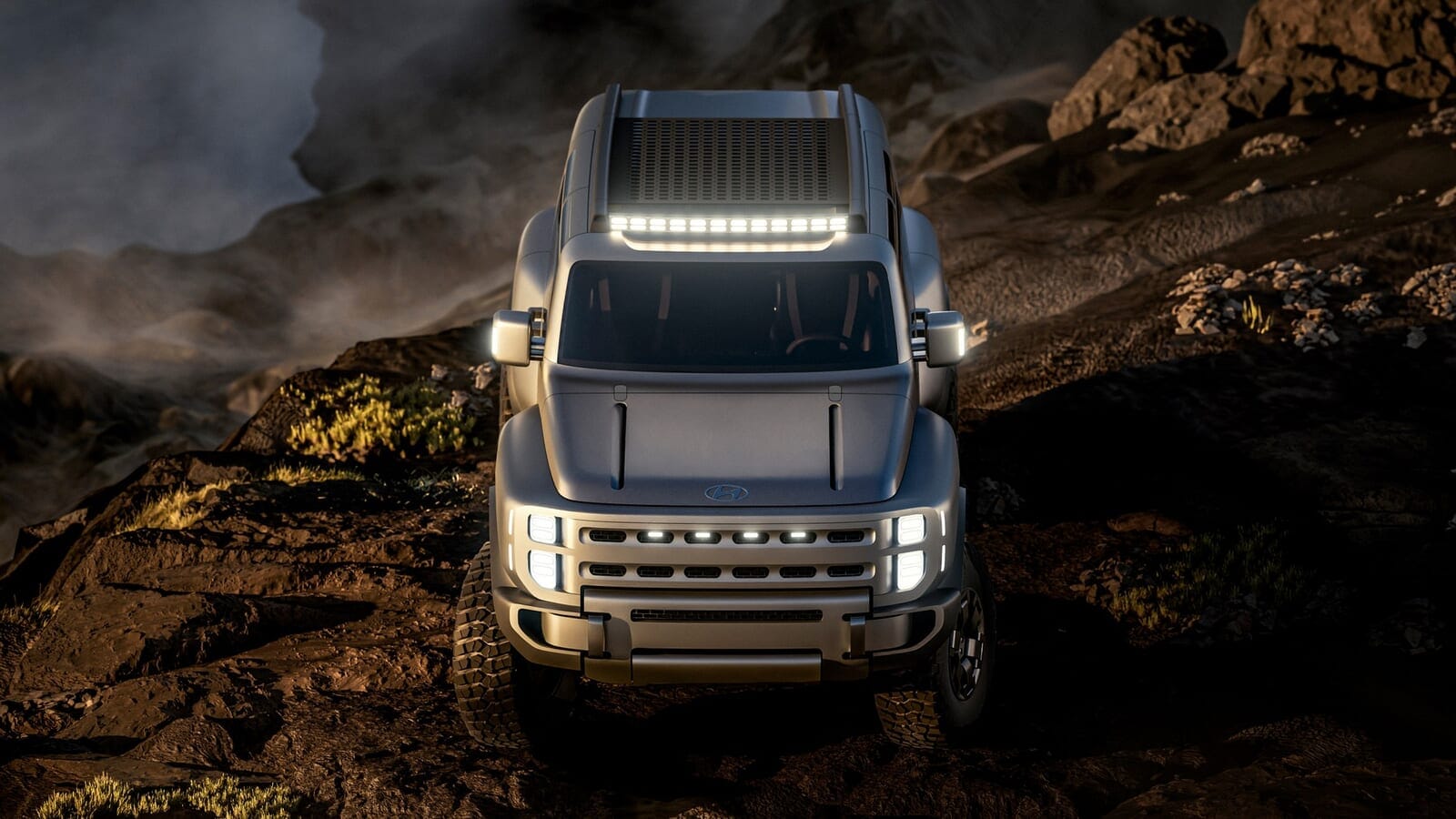 ヒョンデ ボルダーを紹介しよう。これはあらゆる意味でランドローバー ディフェンダー(※1)の雰囲気を醸し出している、無骨なオフロードコンセプトであり、そのままダカールラリー(※2)に参戦できそうなルックスを備えている。