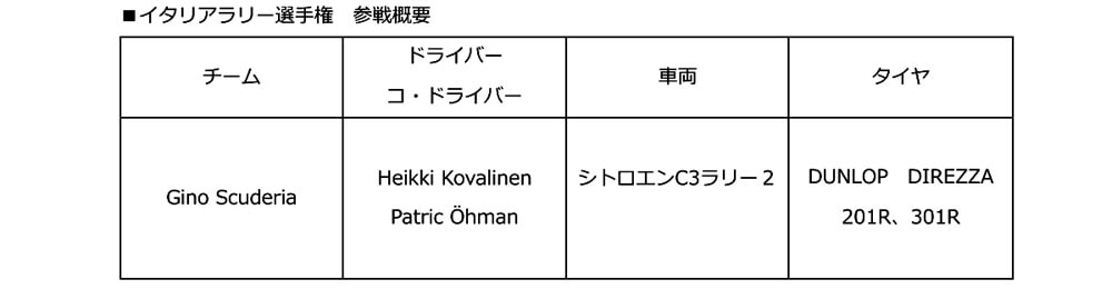 イタリアラリー選手権は、イタリア国内で最も格式が高く、トップチームや有力ドライバーが集う最高峰のラリーカテゴリーだ。今回の参戦は、ダンロップのモータースポーツ活動のさらなるグローバル拡大を図る中で、コバライネン選手のイタリアラリー選手権挑戦のタイミングと合致したことから決定した。
