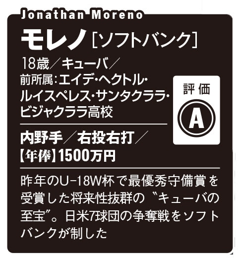 最後に、とびきり若い逸材を紹介したい。ソフトバンクが育成契約した内野手、ジョナサン・モレノだ。