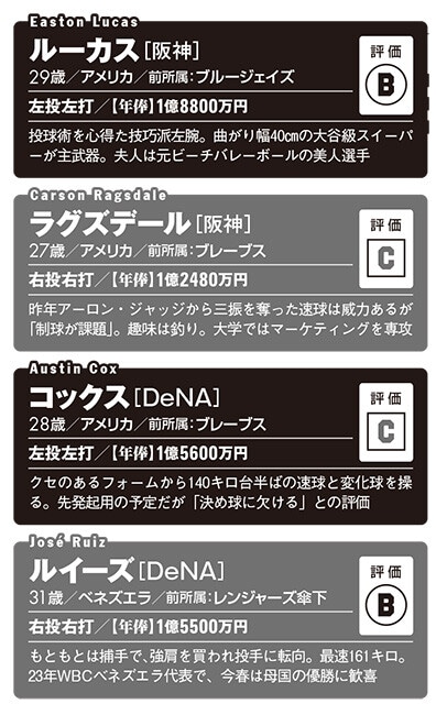 「球速やボールの力だけでなく、制球面で評価が高い投手は、先発なら日本ハムのサウリン・ラオ、リリーフならヤクルトのヘスス・リランソ、DeNAのホセ・ルイーズ。阪神からDeNAに移籍しNPB2年目となる先発右腕ジョン・デュプランティエもこのタイプですね」(パ某球団スコアラー)