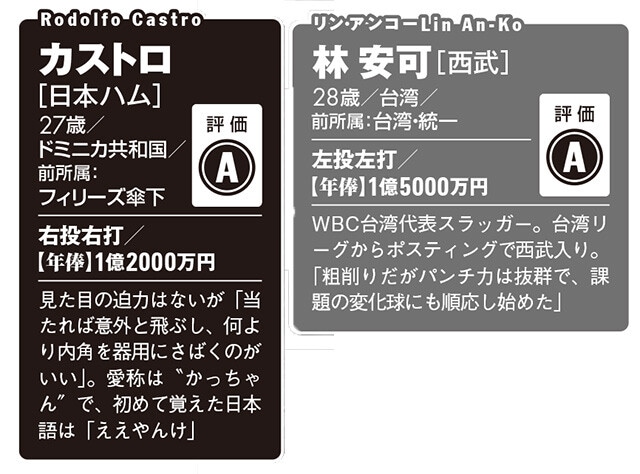 また、西武の林安可(リン・アンコー)はパワフルな左打者で、ツボにはまれば相当な数字を残す潜在能力を持っています。今のところ変化球に対してはもろさを感じますが、マジメでいろいろなことを吸収するメンタリティがあるようなので、日本に慣れればより怖い存在になりそうです」(セ某球団スコアラー)