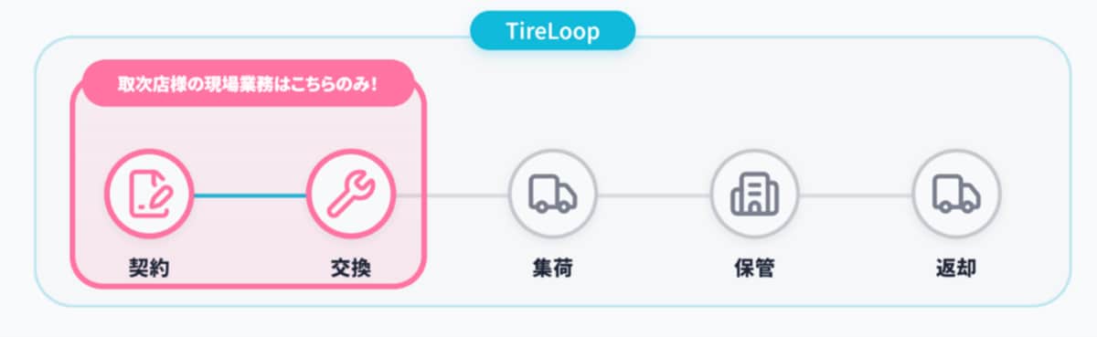 TireLoopは、集荷、保管、返却、契約管理、交換案内までまるごと代行します。取次店が担うのは「契約対応」と「交換作業」のみ。現場負荷が大幅に軽減されます。