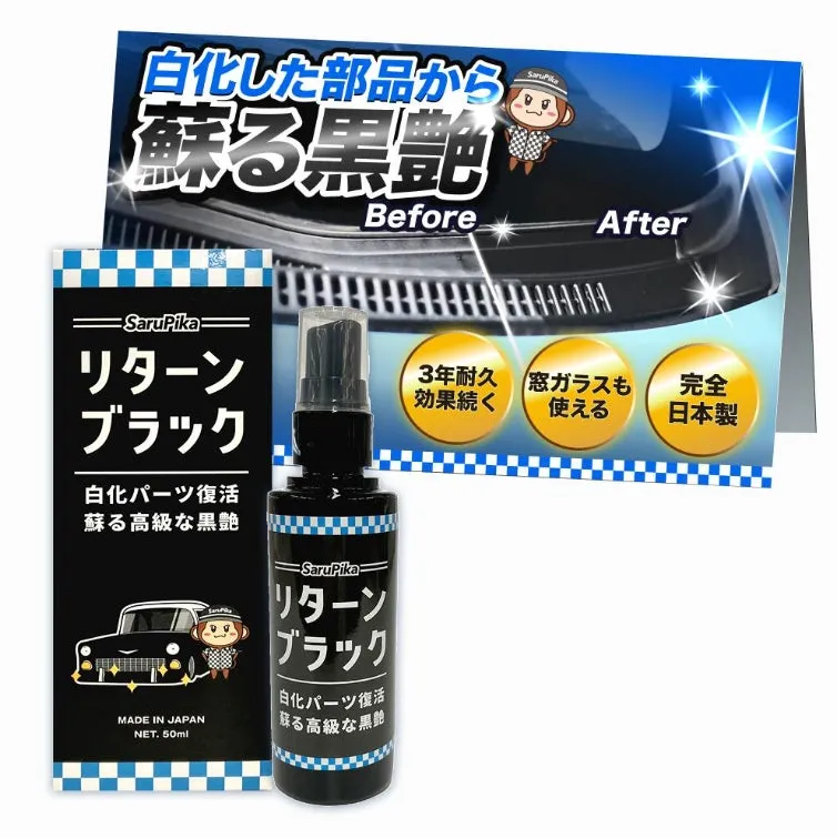 長期間の紫外線曝露により白化した自動車の未塗装樹脂パーツ(ダッシュボード、ワイパーの付け根、ゴムモールなど)の見た目を改善する製品が「SaruPika リターンブラック」である。本製品も「ウロコ取り」と同様に研磨を必要としないため、パーツを傷つけることなく施工できる点が特長である。同社は、これにより白化したパーツが新車のような黒艶を取り戻すと説明している。適用範囲が広く、様々な未塗装樹脂パーツに対応するほか、日本製である点も品質への信頼性を示している。