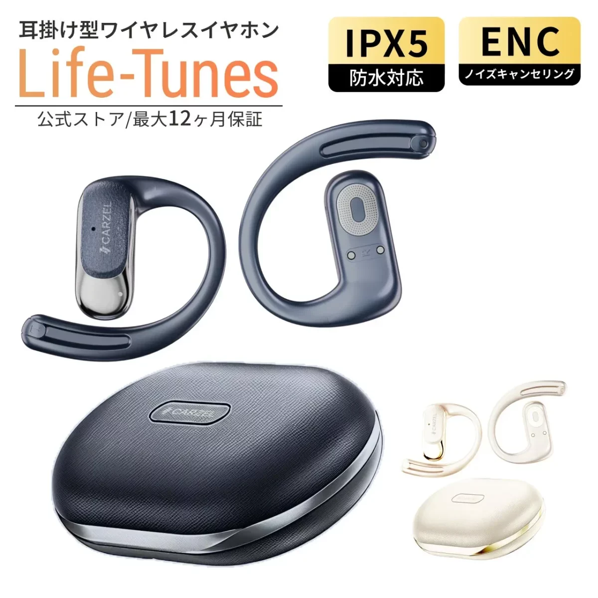 「CARZEL Life-Tunes」は、耳を塞がない「オープンイヤー型」(耳の穴を直接塞がずに音を伝える構造)のワイヤレスイヤホンである。長時間の使用でも耳への負担が少ない超軽量設計(片耳約7.5g)が特長である。耳が蒸れにくく衛生的であることに加え、周囲の音も自然に聞こえるため、自動車の運転中や子育て中など、周囲への警戒が必要な状況での「ながら聴き」に適していると同社は説明する。また、IPX5相当の防水性能(あらゆる方向からの噴流水に耐える性能)を備えているため、汗や急な雨にも対応する。