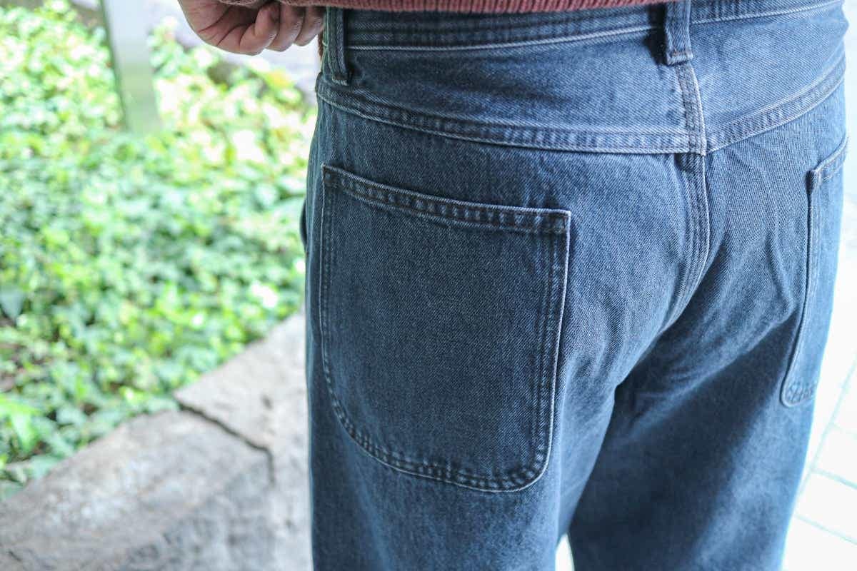 デザインはバックポケットがひとつ付いた、3つポケットタイプ。全体のシルエットは太めで、穿いたときにストンと落ちるストレートシルエットです。