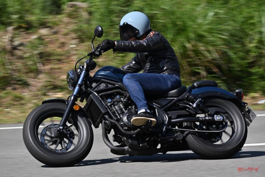 最高出力46psの2気筒エンジンは、250にはない余力があり、120km/hまでは当然自由自在に加速可能。パワーはまだ余りある上に、気になる振動も出てこない。そして最高速はおそらくレブル250+30km/h程度まで出るだろうが、その領域は風圧との格闘になるはず。そして、前後サスペンションも減衰性能が足りないようで路面への追従性が低下し、不安になる跳ね方がじわじわと発生してくる気配がある。250と同様に、このスタイルのモデルでは500ccであっても120km/h以上の領域での巡航性能はそんなに必要ないだろうと感じた。ただし、ワインディングでは魅力的で、250のようにパワー不足を感じる場面は皆無。