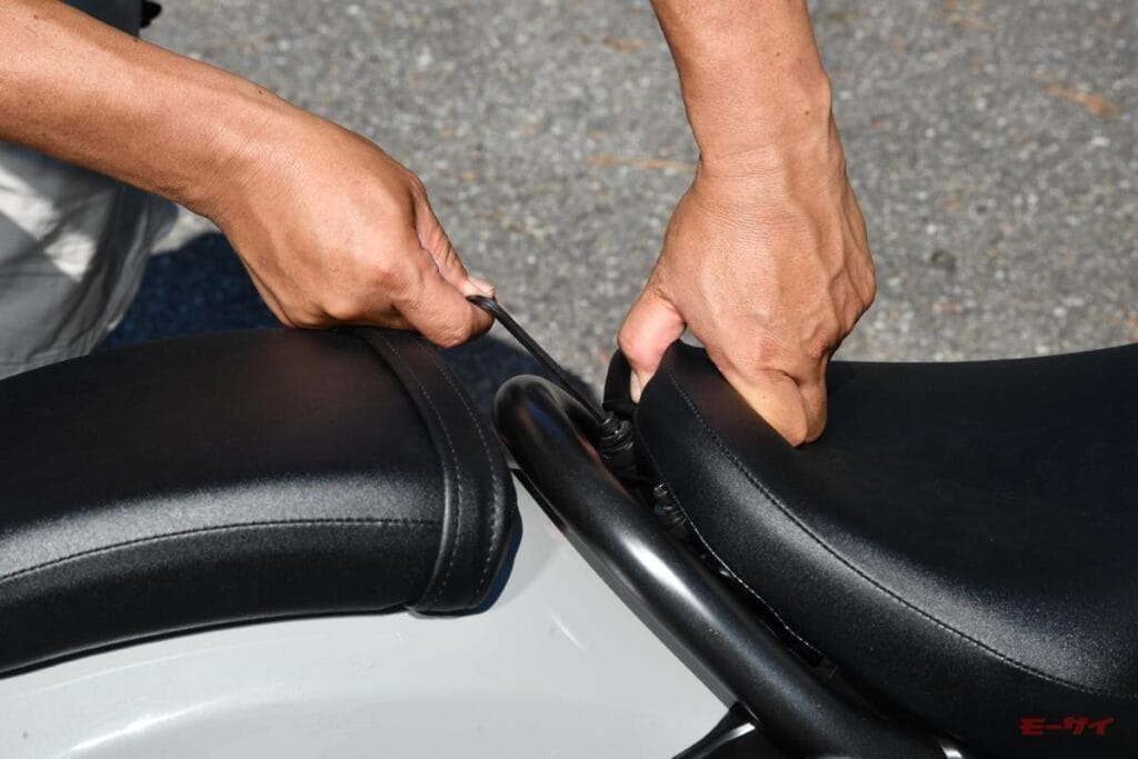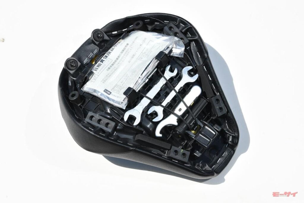 ■前席シートは、六角レンチ用のネジ1点での固定式で、シートベースの裏に書類、簡易的な車載工具が備わる。だが、ここにアクセスするには六角レンチの常備が必要ということ。脱着は難しくないが、これがキーロック方式だったらもっと便利。