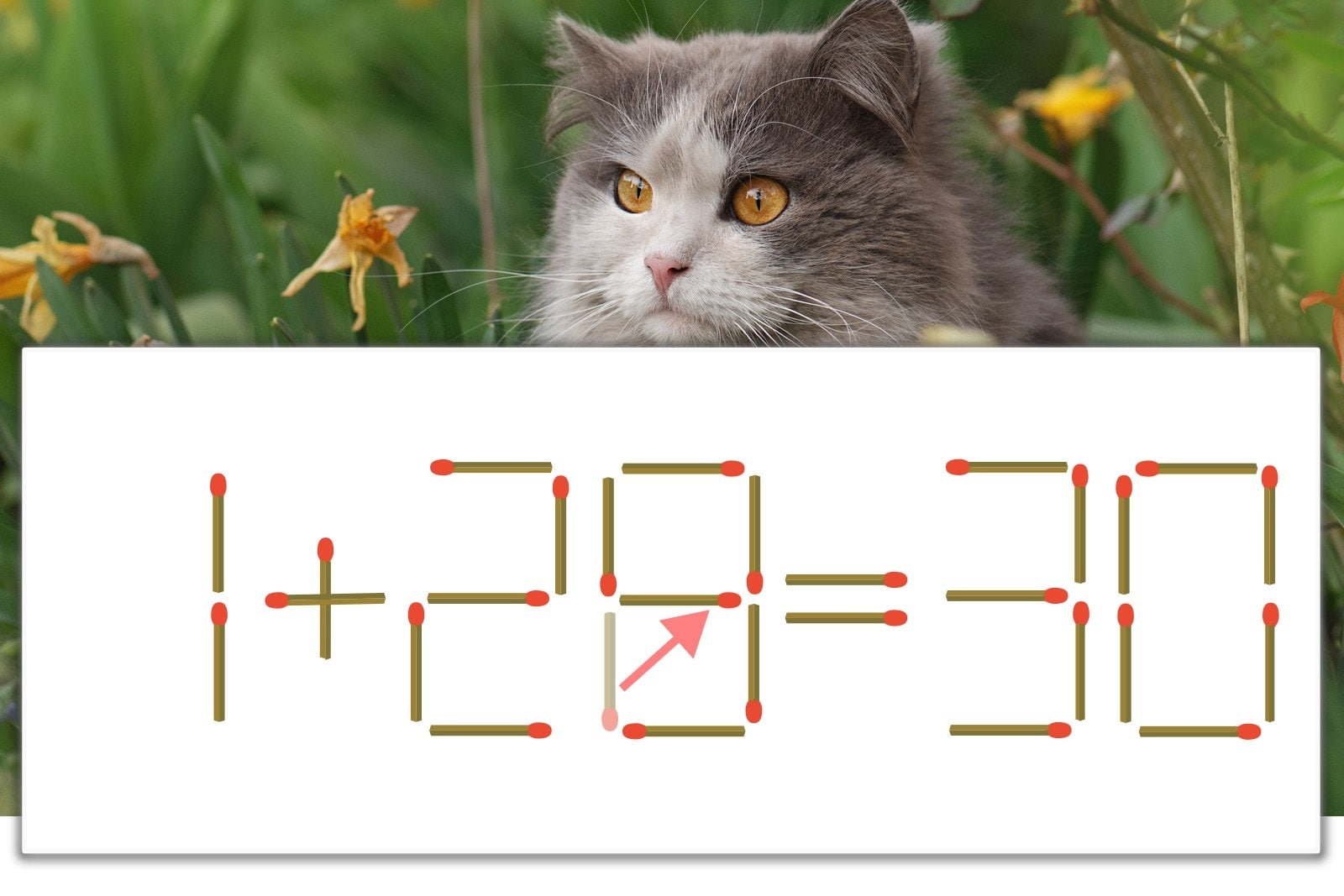 「0」を別の数字に変化させると答えが導き出せます。「0」のマッチ棒を1本移動して、「0」を「9」にしてみましょう。すると、「1+29=30」が成立します。