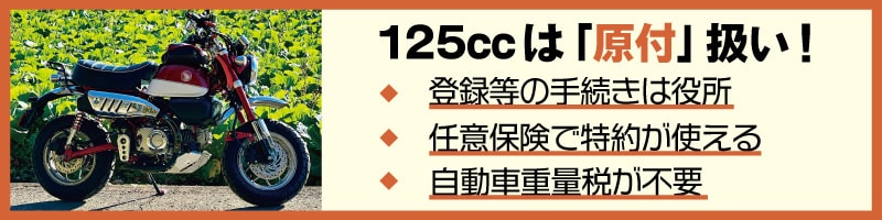 そのため、道路運送車両法が関係する手続きなどにおいて、125ccのバイクは50ccのバイクと同じような扱いをうけます。