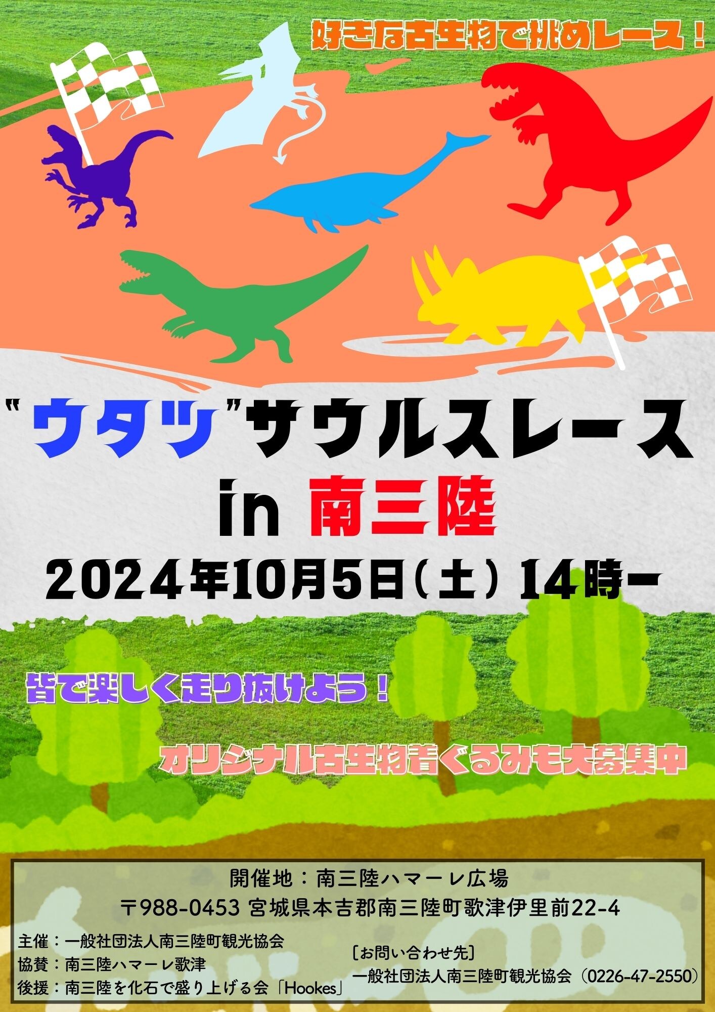 あちこちで人気の「ティラノサウルスレース」が一風変わった形で開催される。宮城県南三陸町では、好きな古生物の姿で芝生の上を走り抜ける「"ウタツ"サウルスレース」(南三陸町観光協会・宮城県本吉郡南三陸町)が10月5日に開かれる。