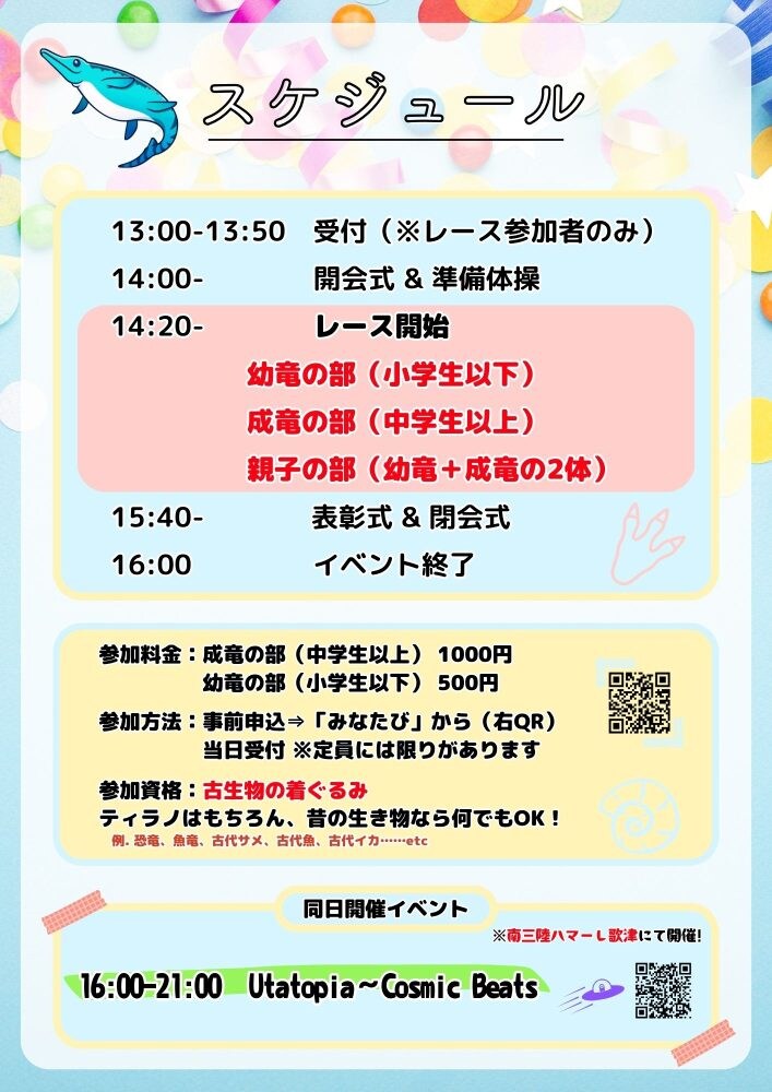 開催地の南三陸町歌津地区を代表する化石「ウタツサウルス」にちなんだレース。南三陸ハマーレ広場を太古の生き物たちが疾走し、その速さを競い合う。あちこちで開催されている「ティラノサウルスレース」を原点に、ティラノ以外の古生物も走れるようにしたいと企画した。当日使用する着ぐるみはティラノはもちろん、太古の生き物なら魚竜でも古代サメでも、古代魚、古代ワニ、古代イカと何でもOK。上半身が出ているタイプ、布製の着ぐるみなど、指定もない。準備体操をして走ってみよう。