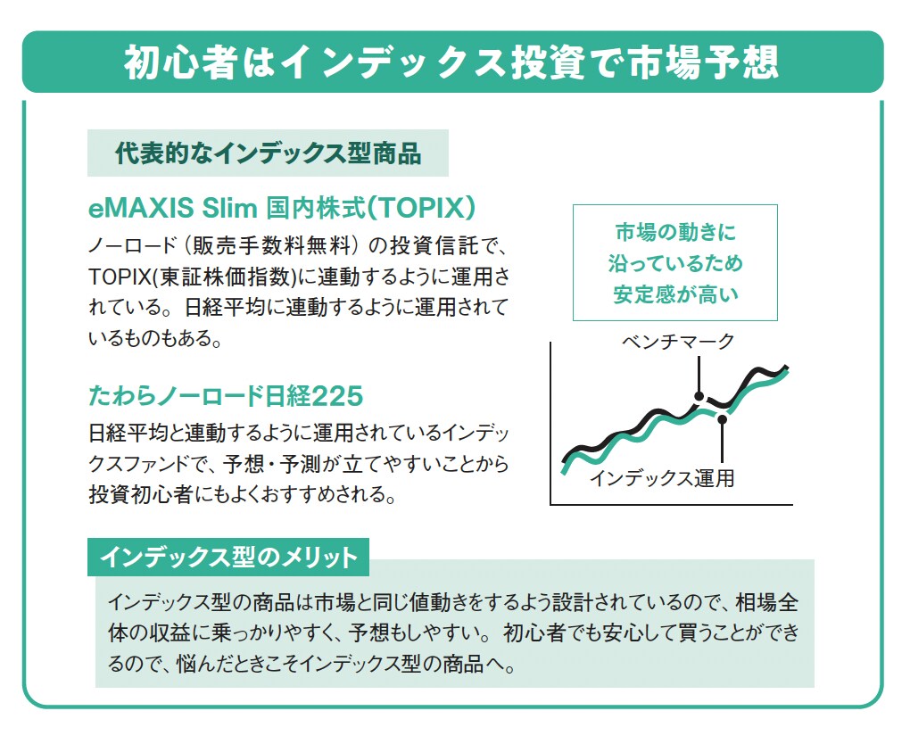 そうしたことからも、市場の値動きと連動するインデックス型(60~61ページ参照)の商品を候補にするといいでしょう。